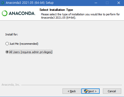 user 범위 설정 메뉴가 나온다. 사용 목적에 맞게 설치하면 되지만, all users를 통해 설치하면 다른계정으로 접속해도 사용할 수 있으니 알아서 설치하도록 하자. 나는 all users 옵션으로 설치하였다.