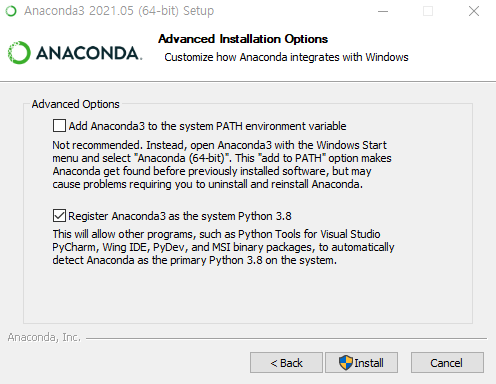 여기서 환경변수를 추가할지를 묻는데, 자신의 컴퓨터에 파이썬이 깔려있는 것이 아니라면 add~를 체크하여 환경변수에 추가해주자. 환경변수에 추가해주어야 cmd창에서 경로와 상관없이 anaconda를 파이썬으로 인식하여 여러가지 기능을 사용할 수 있다.