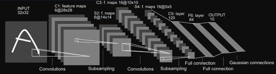 LeNet-5모델은 2개의 CNN Layer를 가지며, 각각의 레이어는 6개의 필터와 16개의 필터를 사용한다. 또한, 그 사이에 풀링 층을 첨가하여, 총 두번의 풀링을 진행하여 계산의 복잡도를 줄인다.