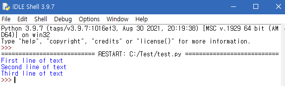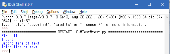 contents에 저장된 문자열을 출력. 이때, contents에 저장된 문자열은 두번째 줄에서 알아보았듯 불러온 파일의 내용물이다.