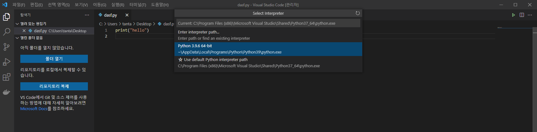 정상적으로 python 인터프리터가 컴퓨터에 설치된 상태라면 위의 사진과 같은 팝업이 오른쪽 하단에 뜰 것이다. 즉, 해당 python 파일을 해석할 인터프리터를 지정하지 않았다는 뜻이다. 따라서 select python interpreter를 눌러 interpreter을 골라주자.